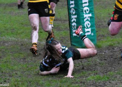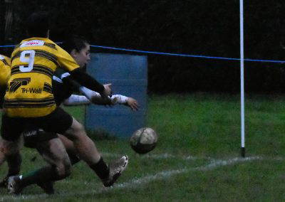 The well drilled side came back on the attack and played well, they forced a couple of penalties and went for lineouts which were working very well, from one such restart the ball came out and from open play fly-half Green chipped to the corner, left winger Greensmith claimed the ball was tackled, but had enough momentum to get over the whitewash. The conversion was missed and the Stags had a slender lead of two points at 19-17.