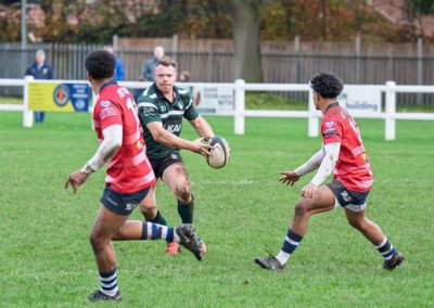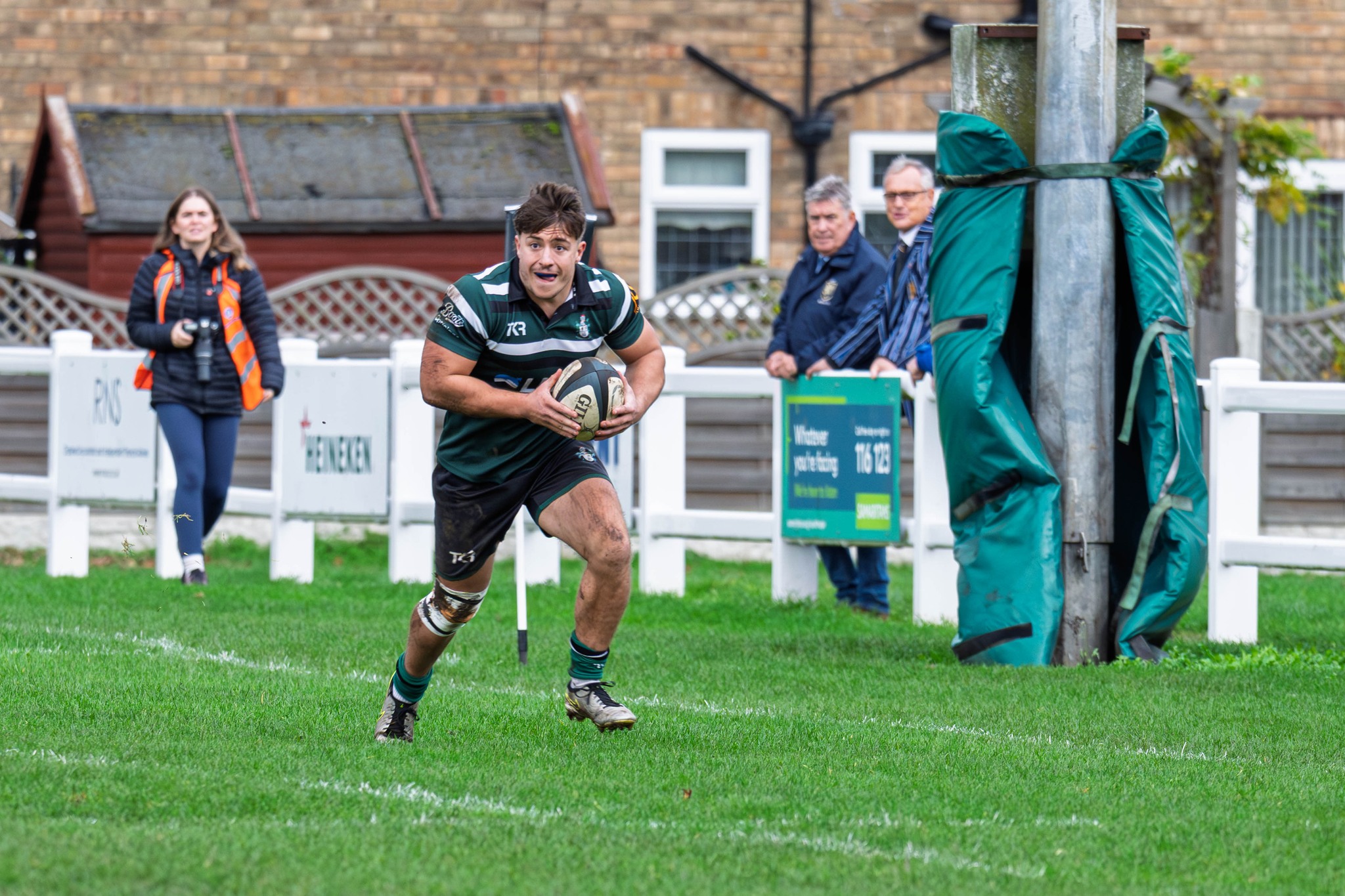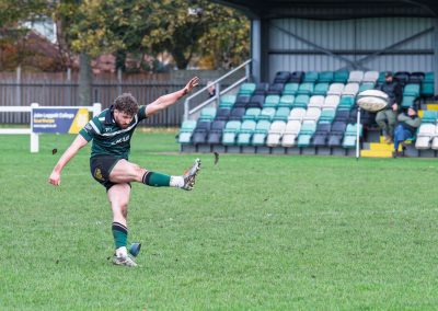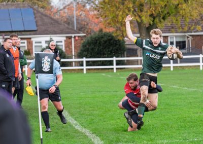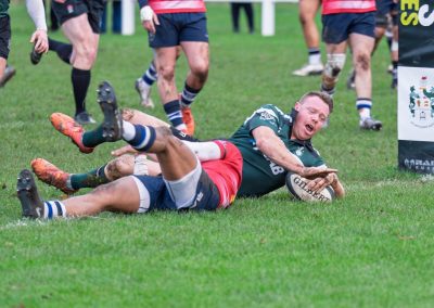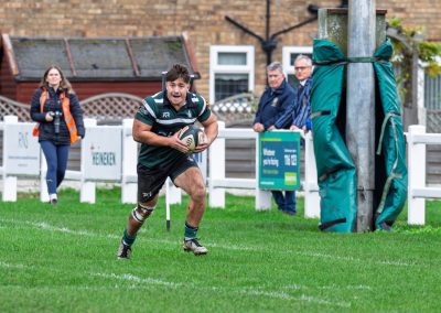 The Greens back on attack and make good ground into the Macclesfield 22. Macclesfield win the line out and play out, the ball going from side to side across the park, they then win a quick ruck and swiftly get the ball into the hands of Manu Shute the winger to go under the posts to score the try. Converted by Harry Oliver.