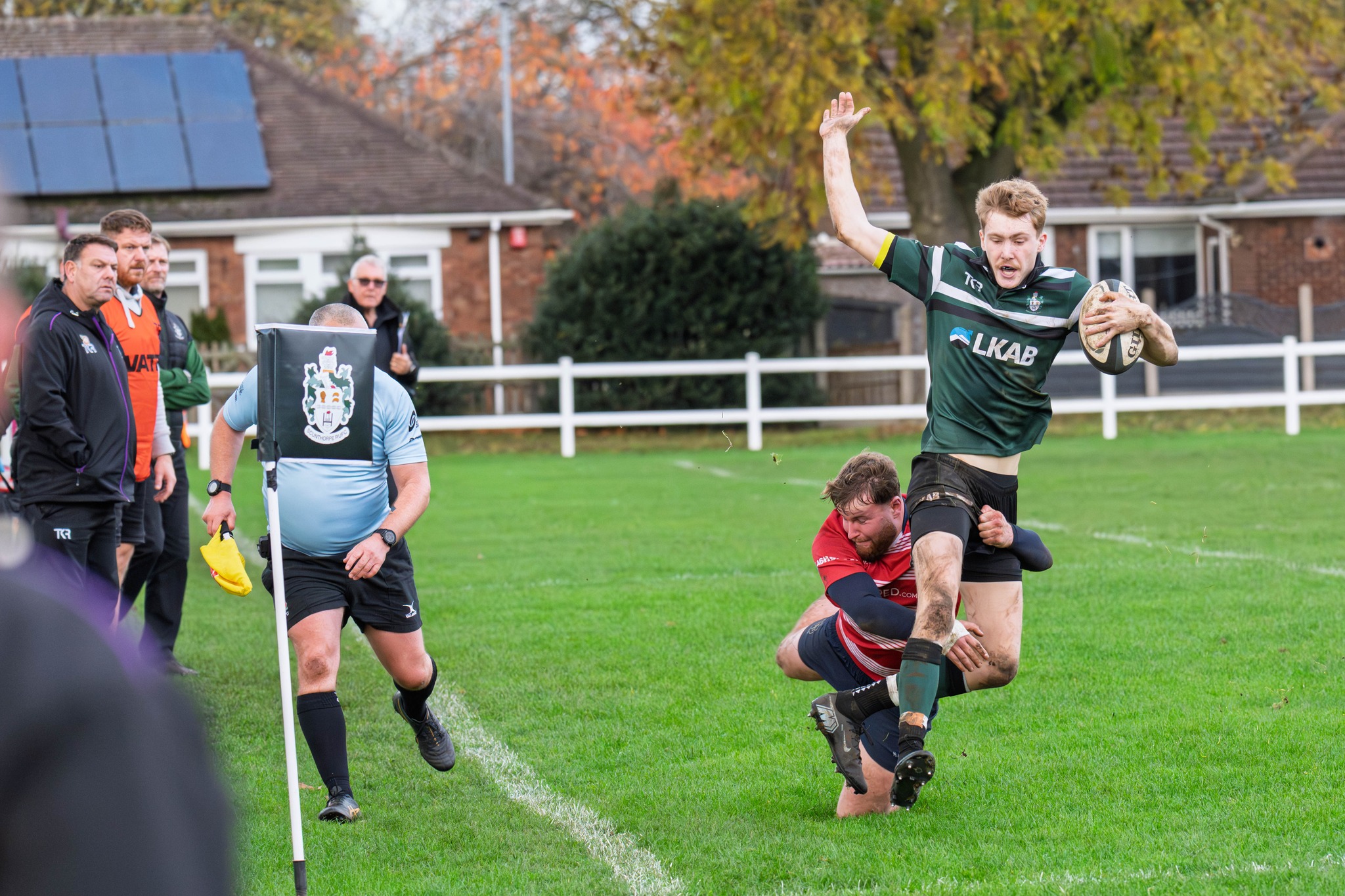 After a couple of drives at the line, Macclesfield are then held up over the line. From the goal line dropout the Greens were soon under pressure again with Macclesfield scoring a try through their full back Dan Leake. Converted by Harry Oliver.